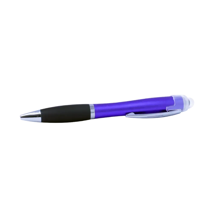 Pens are black with a stylus. LED illuminates the engraving.