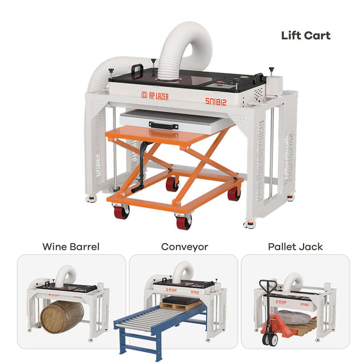 - Low-Rider Carriage Cart: This cart enables precise movement of the laser machine from the top surface to the floor.