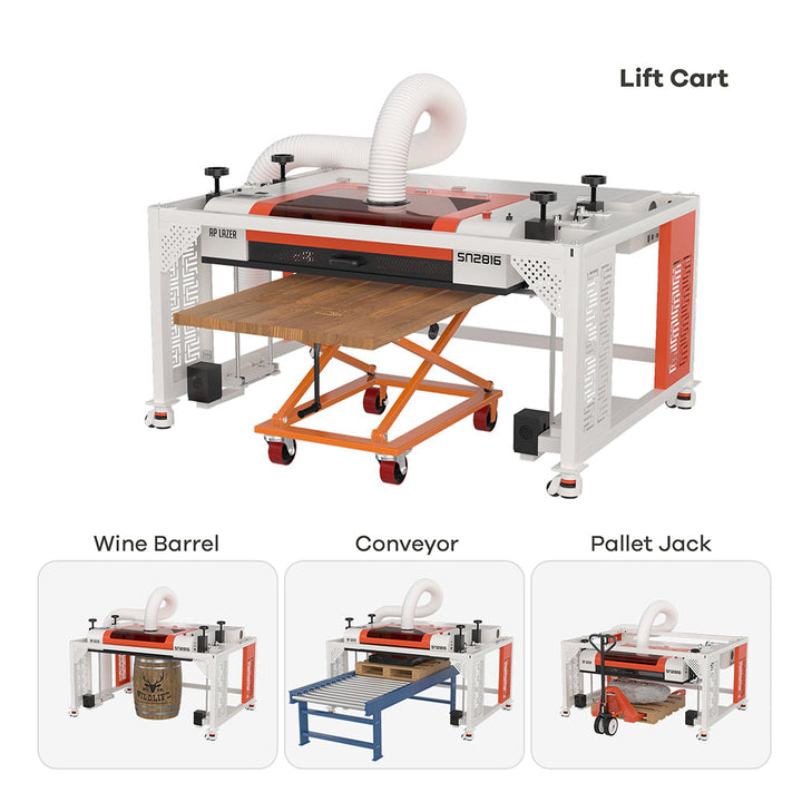 Laser Machine SN2816LR, Z-table, Low-Rider Carriage Cart, plus Mechanical Lift Cart. Honeycomb Cutting Table, Rotary Table. Air Assist, Exhaust Blower. Laptop + Windows. LightBurn software, CORE SUITE, PHOTOGRAV. Safety Classes. One-on-one Training. 3 Years Warranty.
